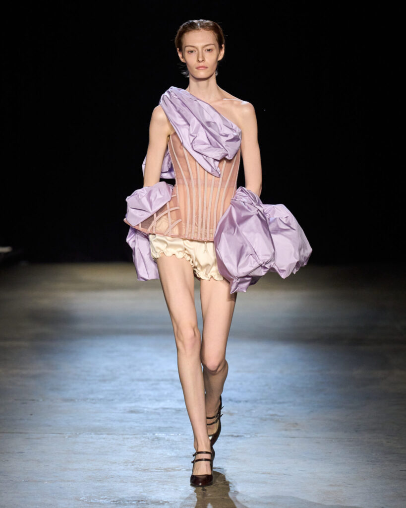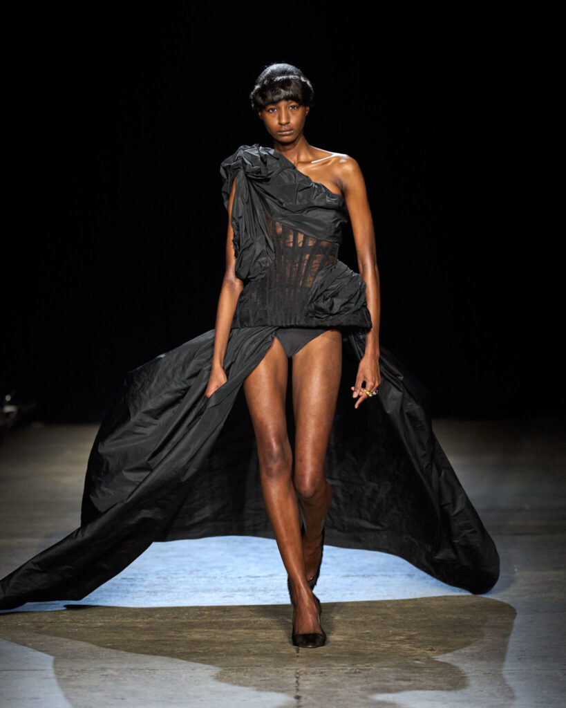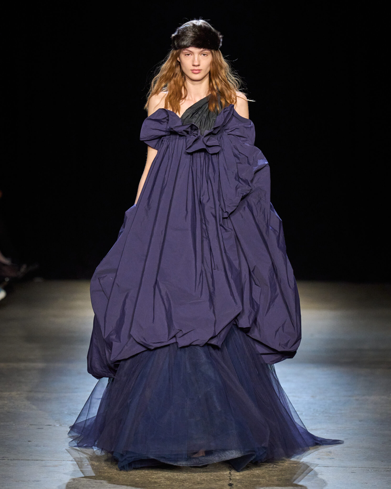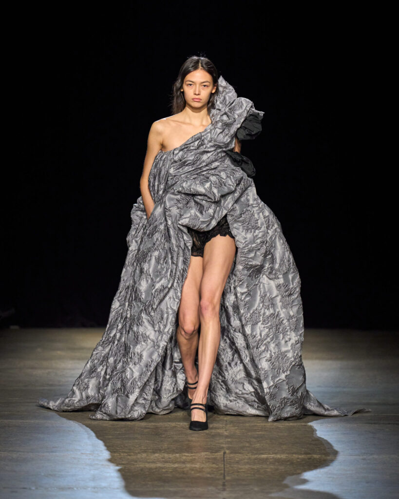 Act III: Teardrops brought emotion to the surface. In the original fairy tale, tears hold warmth — they break the spell. Nielsen translated that moment into softness. Structure began to ease. Textures felt more fluid. There was tenderness in the silhouettes without losing strength. The thaw didn’t erase the power; it humanized it.