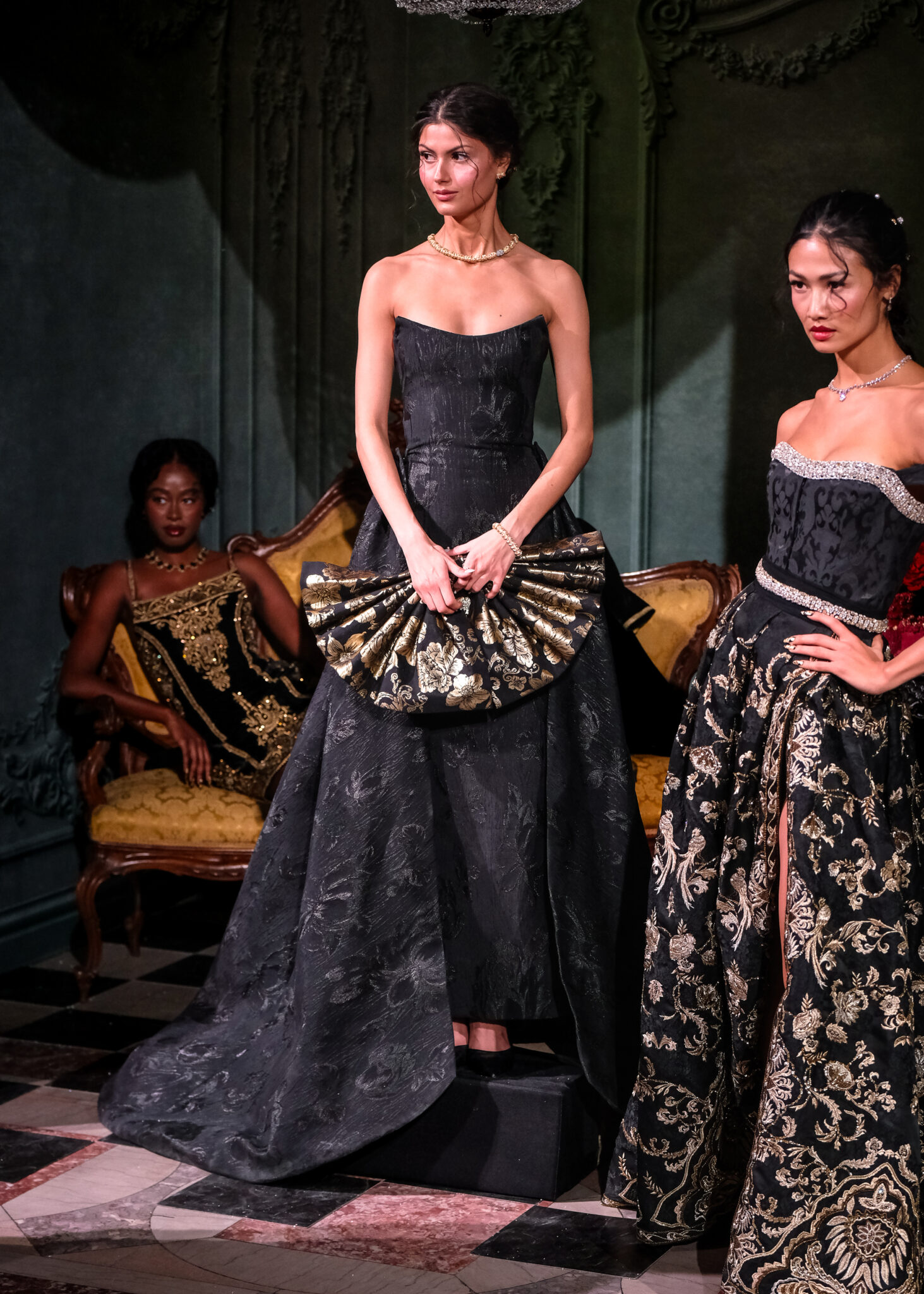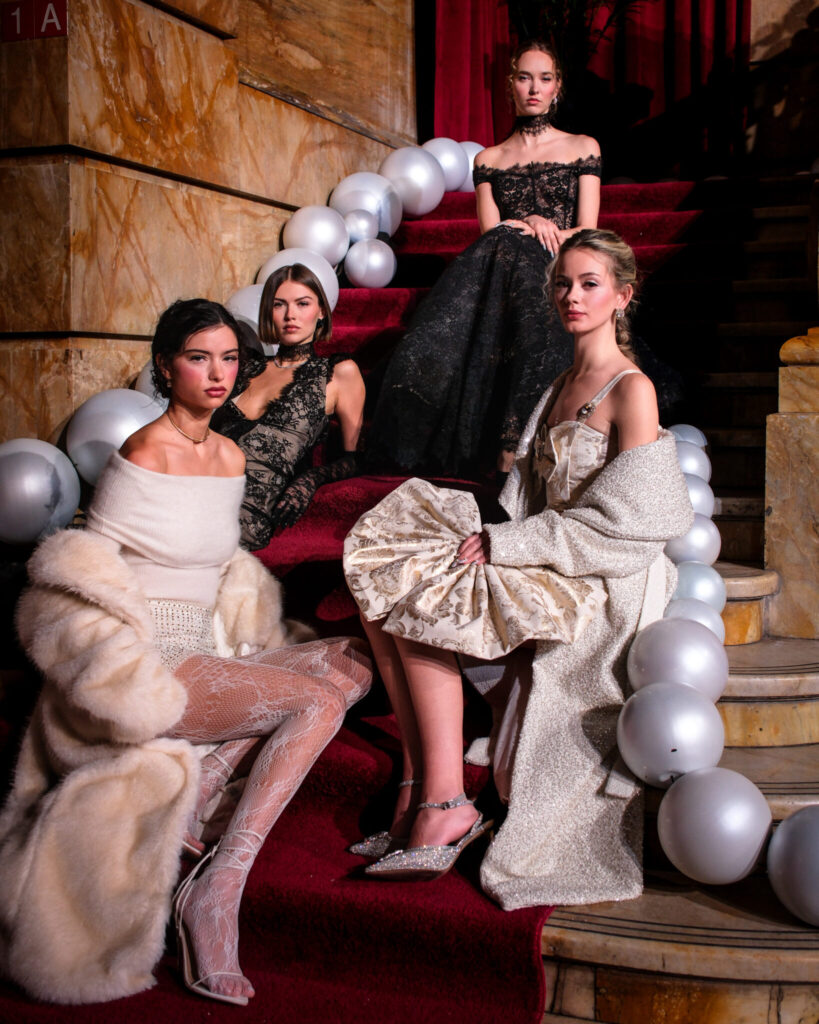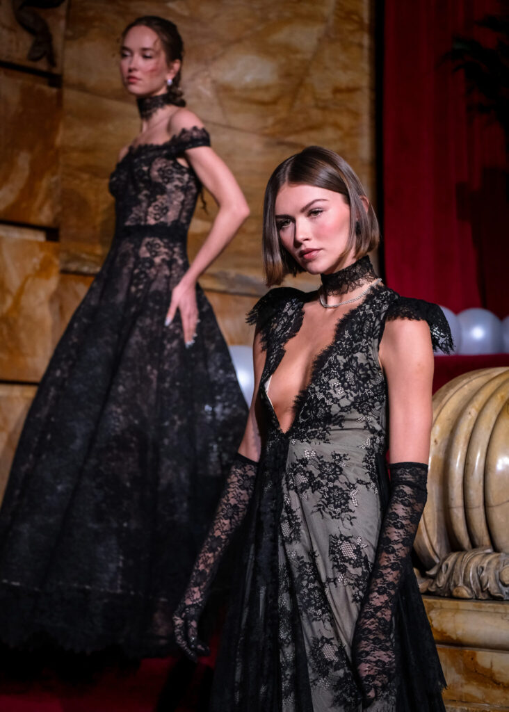 Crystal-encrusted gowns that shimmered like heirlooms. Brocade capes and corsetry that nod to Rococo romance but are styled for the woman who runs the room today.