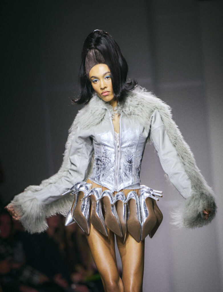 Cowan also challenged the gendered codes of restriction and adornment. Men walked in corsets, reframing the conversation around structure, sensuality, and ownership of the body. The result was not costume, but commentary.
