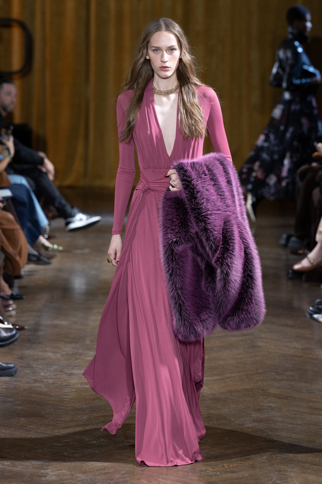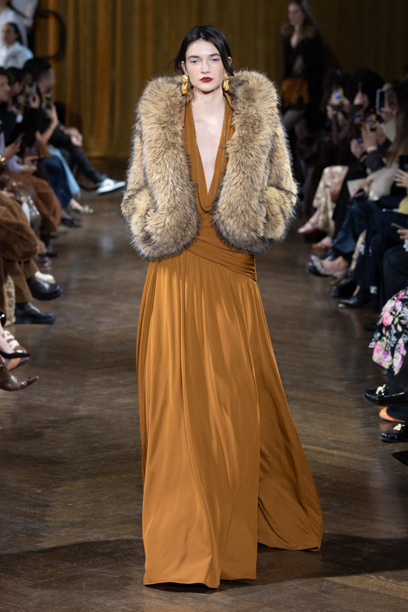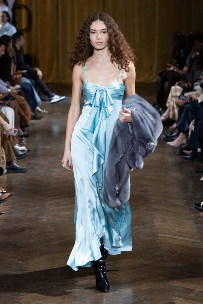 Fall 2026 channels the untamed poetry of folk rock with a modern revival of opulence. Cascading ruffles, gilded embroidery, and romantic pussy-bow blouses contrasted against sheer silhouettes, plunging necklines, and raised hemlines. Silk trimmed in lace met regal gold brocade. Plush faux furs softened structured tailoring. It was femininity with intention — never passive, always aware.