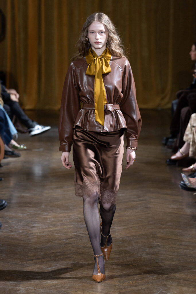 Vegan naplak leather appeared throughout, sometimes doubled into sets, other times layered over softer silhouettes, creating a dialogue between fluidity and control. Gold brocade transformed across silhouettes: first as a slinky slip dress, then as an empire-waist gown with intricate bodice beadwork and tiered skirting, and finally as a dramatic ballgown skirt styled with a leather bomber jacket. That tension, elegance meeting rebellion defined the rhythm of the runway.