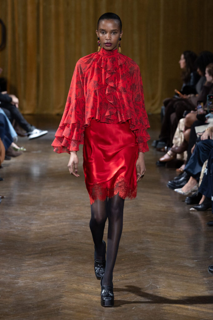 The color palette grounded the collection in ochre, deep burgundy, olive green, and ivory, punctuated by confident bursts of poppy red and saturated blue. A silk lace-trimmed empire-waist dress with an ankle-grazing hem evoked romantic nostalgia, while a floor-length skirt paired with a cinched-waist jacket introduced sharp structure.