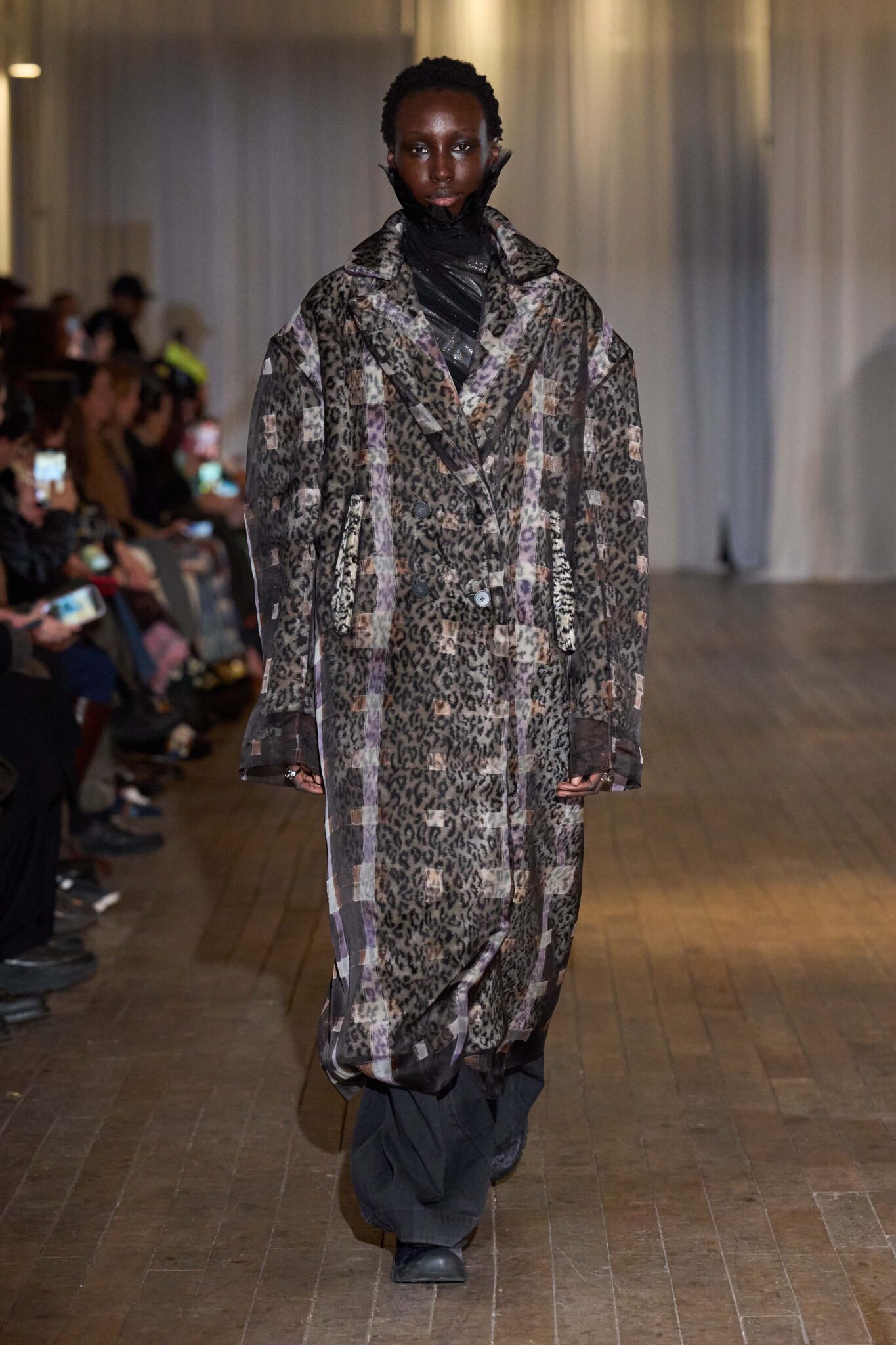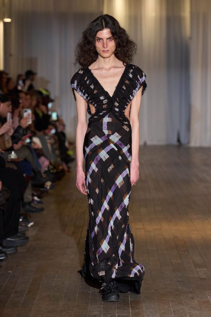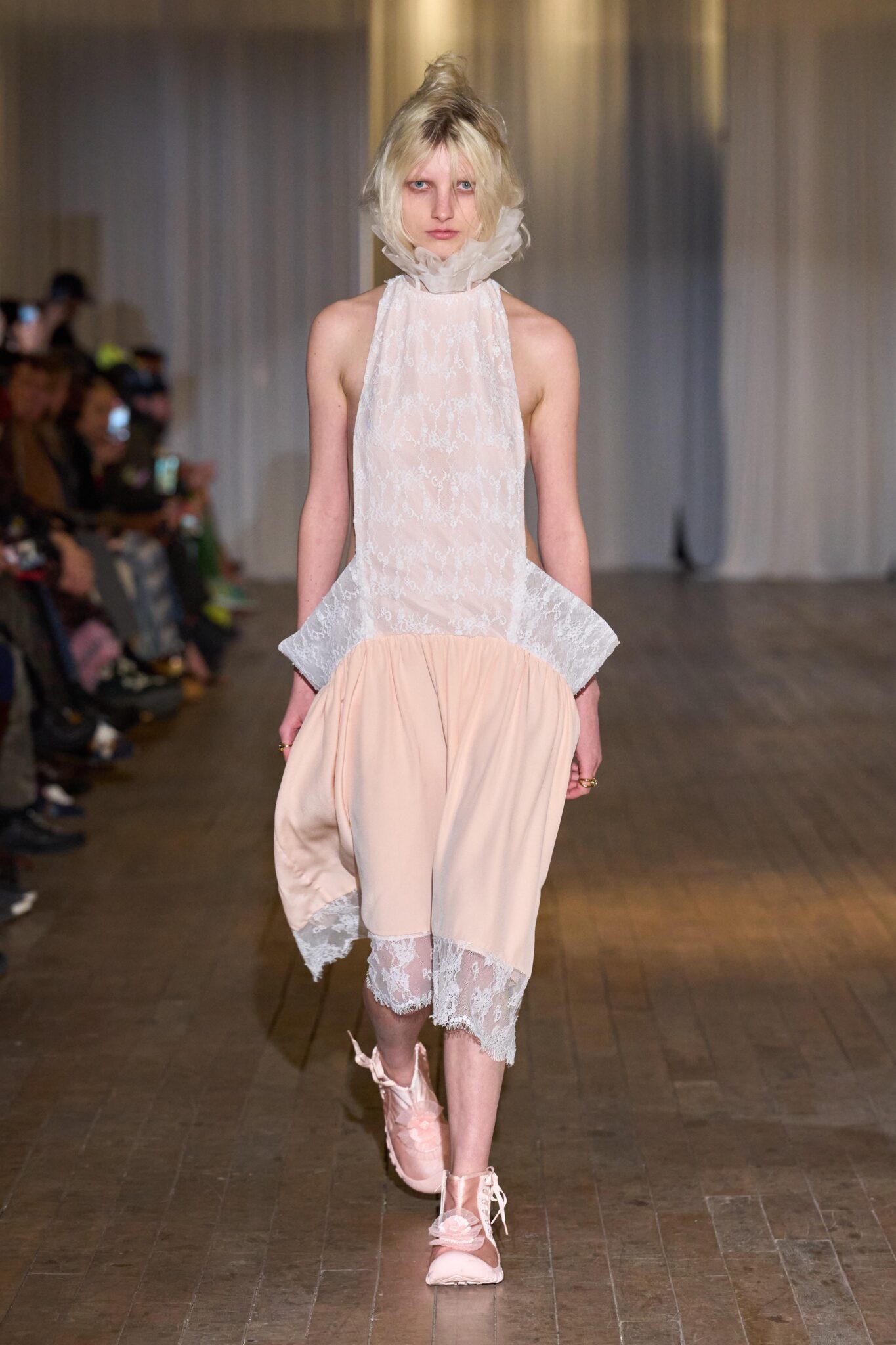 The opening look establishes the tone with an almost ghostly softness. The Lestat dress, made in a white deadstock lace, floats with a spectral presence, then followed by the Plume Gown in mauve chiffon, the kind of look that feels like breath you can see, a feeling of relief. The delicate design hints at the deeper emotional themes explored in the collection.