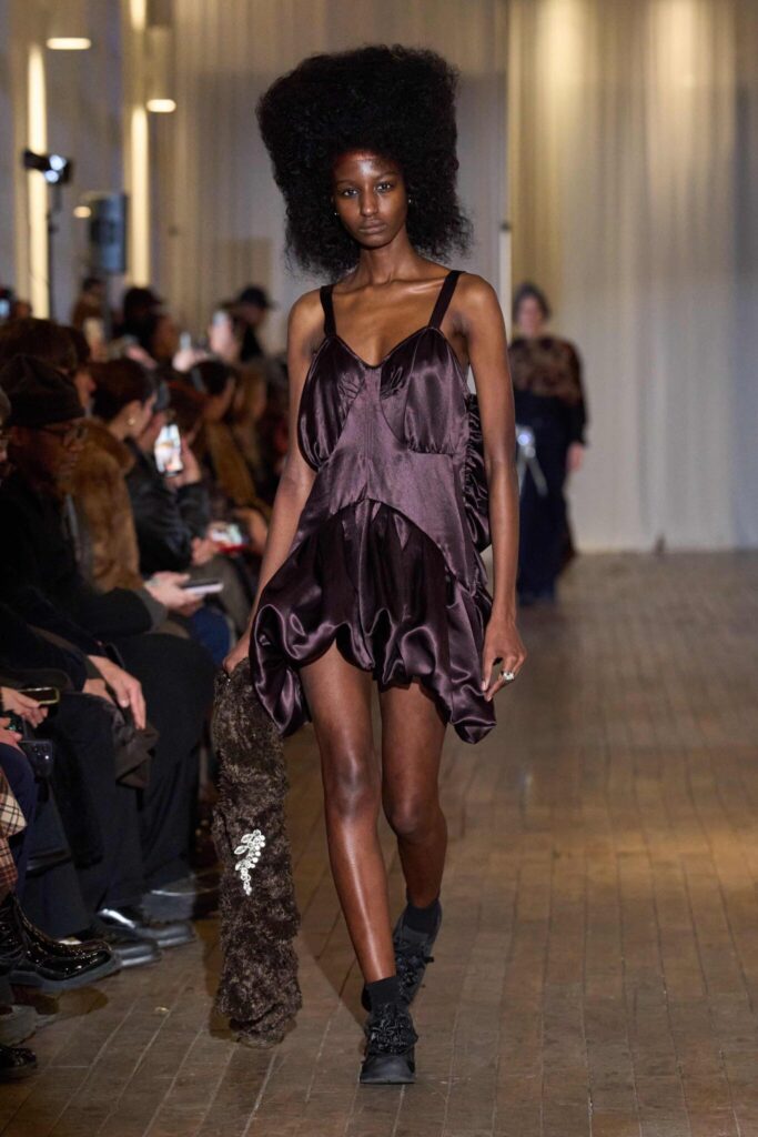 That push and pull define the collection’s compelling moments. The Valerian Slip Dress in chocolate deadstock satin reads decadent and nostalgic, while BIO FlUFF accessories and faux fur re-introduce Taymour’s commitment to sustainability and material experimentation.