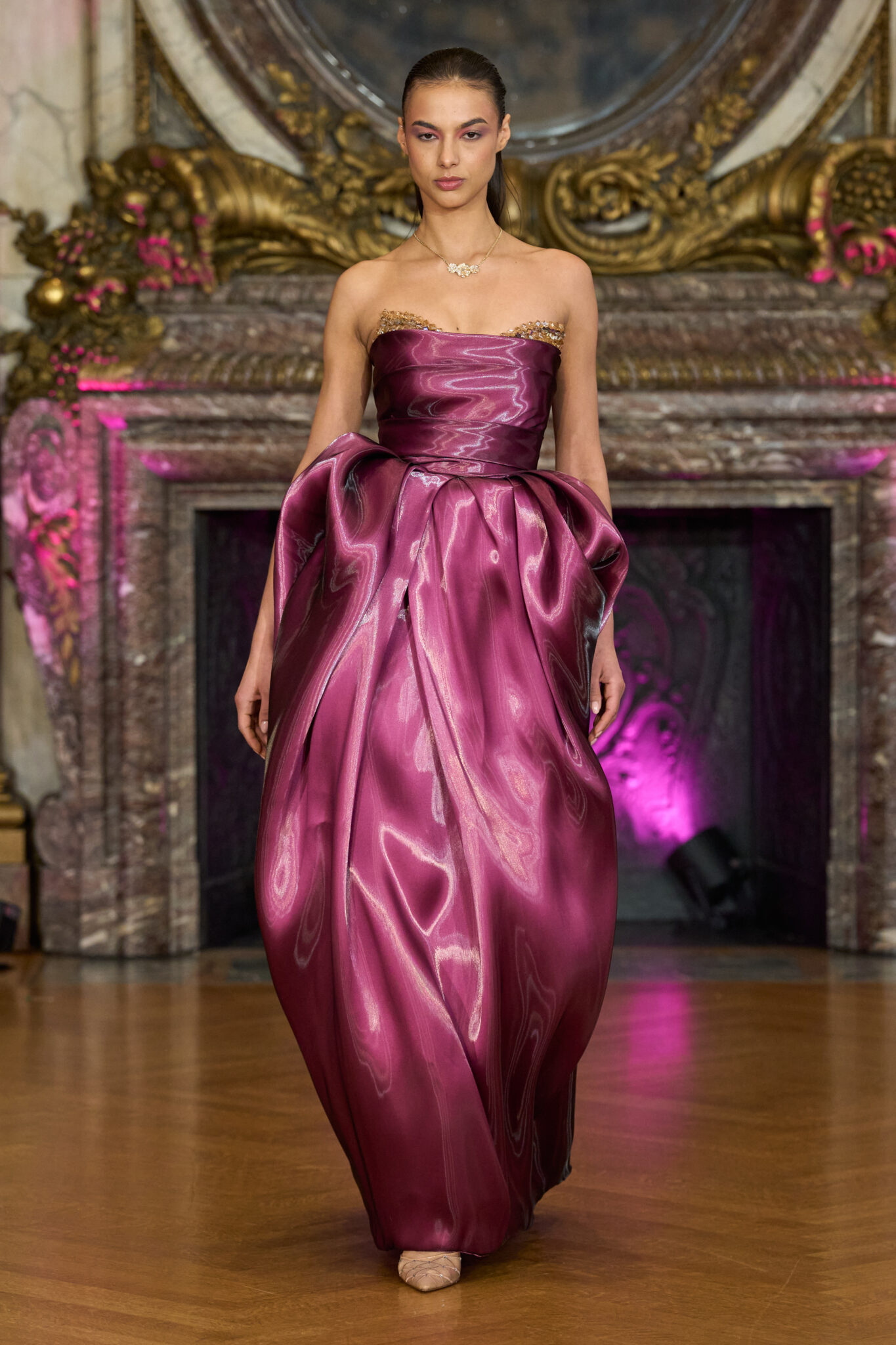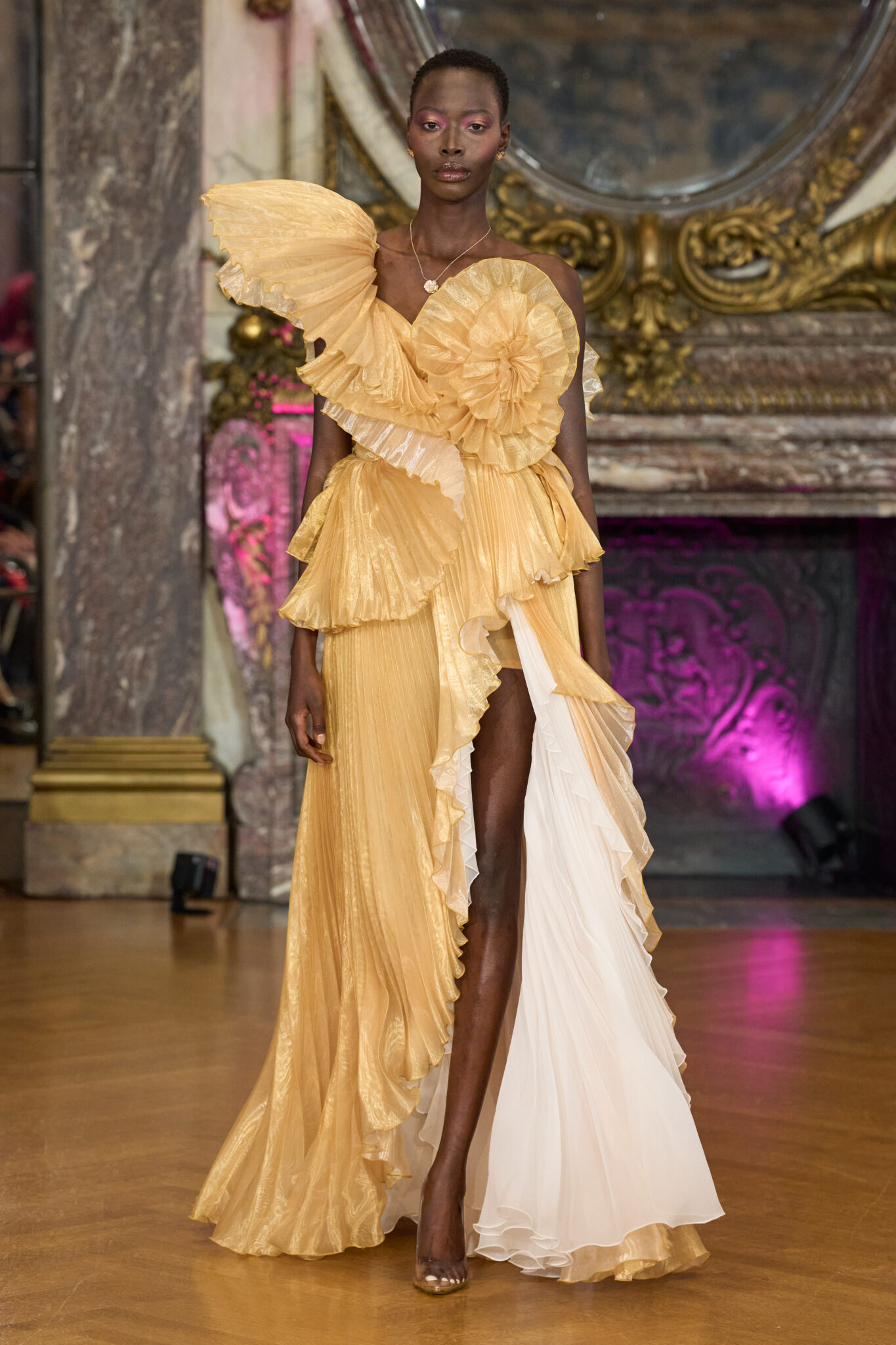 Presented at the historic James A. Burden House, located at 7 East 91st Street on Manhattan’s Upper East Side, the setting elevated the collection’s narrative. The grandeur of the mansion, with its ornate interiors and architectural depth, mirrored the layered complexity of the woman Esé designs for. As models moved through the space, the intimacy allowed every bead, every seam, every structural detail to be seen and appreciated up close.