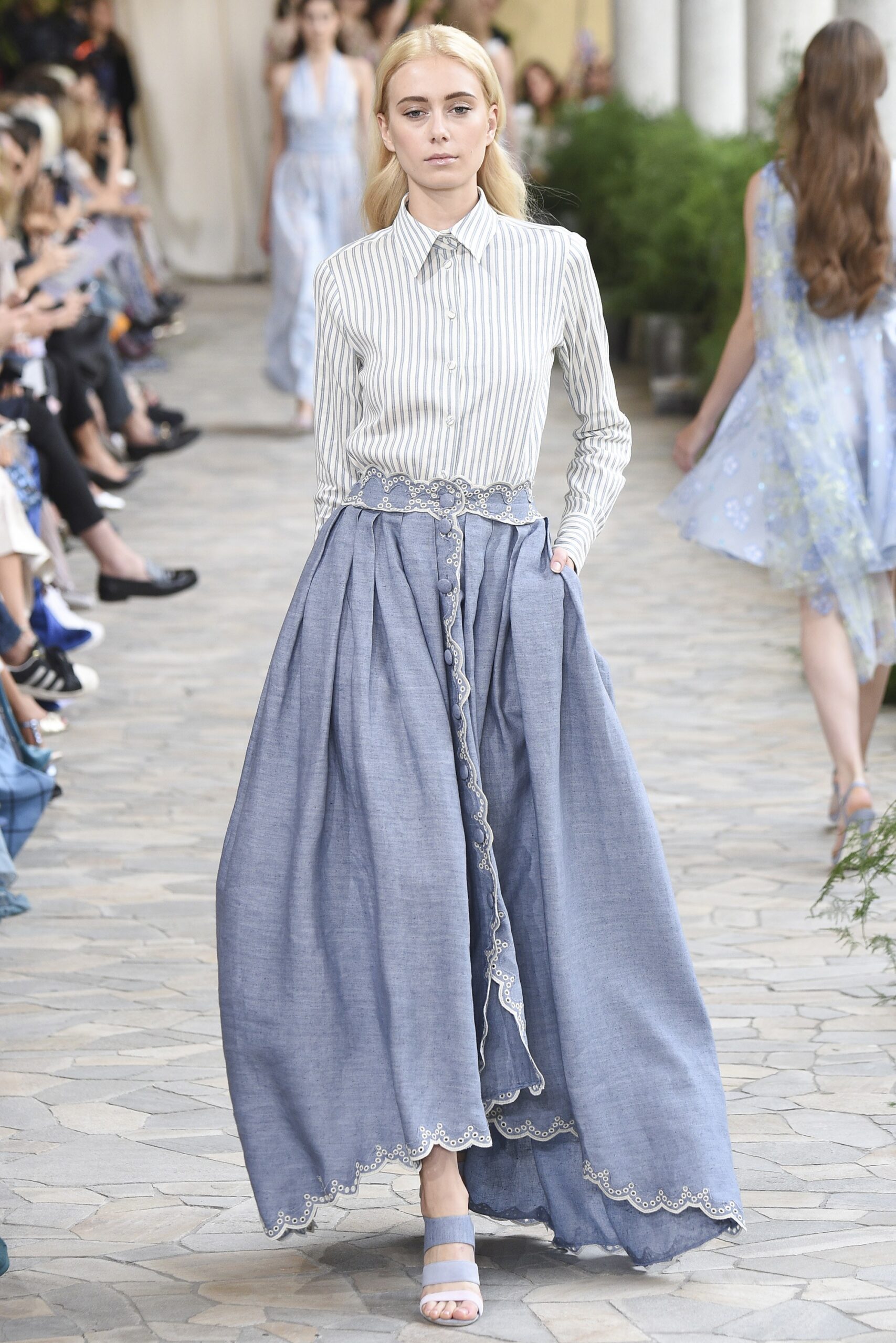Model wearing Luisa Beccaria, Spring 2017 Ready-to-Wear sporting a pinstriped button down shirt paired with a chiffon maxi shirt and finishing the look with trendy slider sandals.
