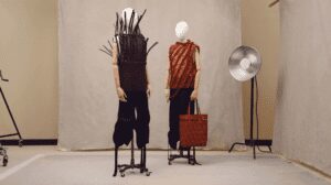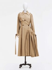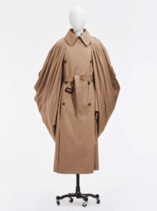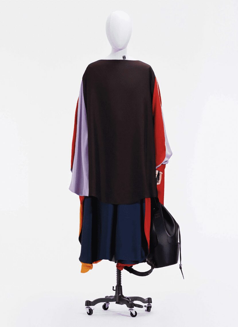 Now let’s take a look at LOEWE’s SS 21 collection. LOEWE’s menswear collection is inspired by curves, loops and circular forms, with the concept “what goes around comes around”. Design trends that used to be popular also makes a comeback in SS 21 menswear collection. One element that stands out is weaving, using various materials such as rope, wicker and leather. Weaving is frequently used in LOEWE’s handbags and shoe designs, but this time there are two tops weaved out of stiff material, creating a complicated pattern and very dimensional aesthetic. The curvy lines used in menswear soften the hard structure and makes the collection appears genderless. The inspiration behind womenswear pre-collection is straightforward creation process on the mannequin, using methods such as gathering, pleating and folding to block out the silhouette on the mannequin.
