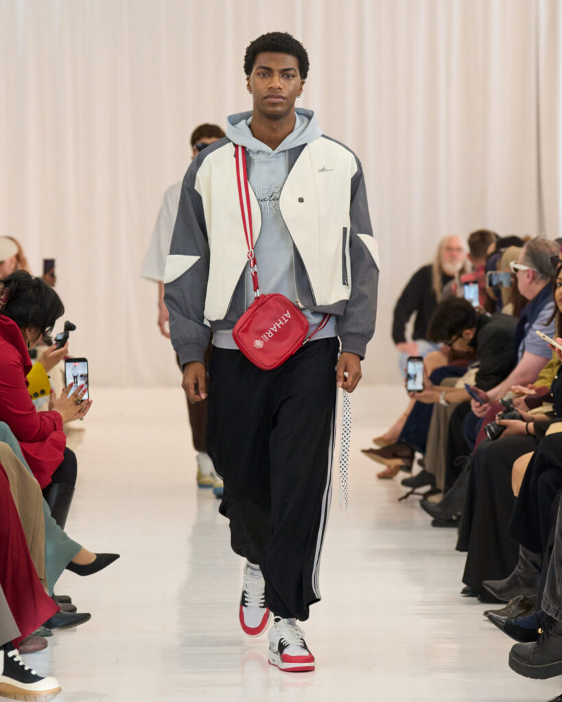 A black-and-white foundation grounded the collection, accented by keffiyeh-inspired pattern work, sand-toned neutrals, and strategic color moments. The pieces moved between streetwear and elevated design seamlessly, embedding cultural symbolism into modern silhouettes.