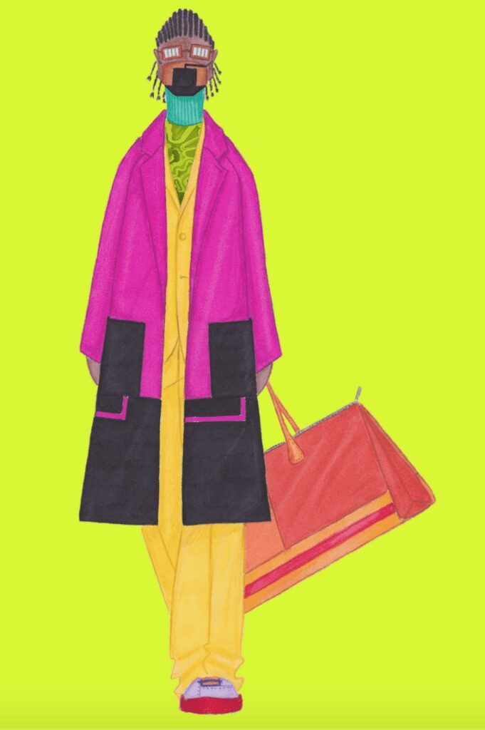 This line was influenced by the artwork of Peter Harley where he incorporates boxy angular shapes into vibrant pieces. The rich lively colors present throughout the collection brings energy into 2021. Each piece has modern undertones mixed with vertical perfection. Oversized coats and bucket hats seem to be a theme as well as turtle necks layered into the majority of the looks.