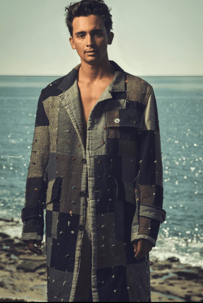 “Surf culture” in Southern California was the main influence for this menswear line. Quilted patterns sewed into long oversized coats and fitted blazers throughout the collection holds stories adding a vintage tone to each piece. The sandy muted tones prevalent throughout the line are comparable to colors that you would find at the beach.