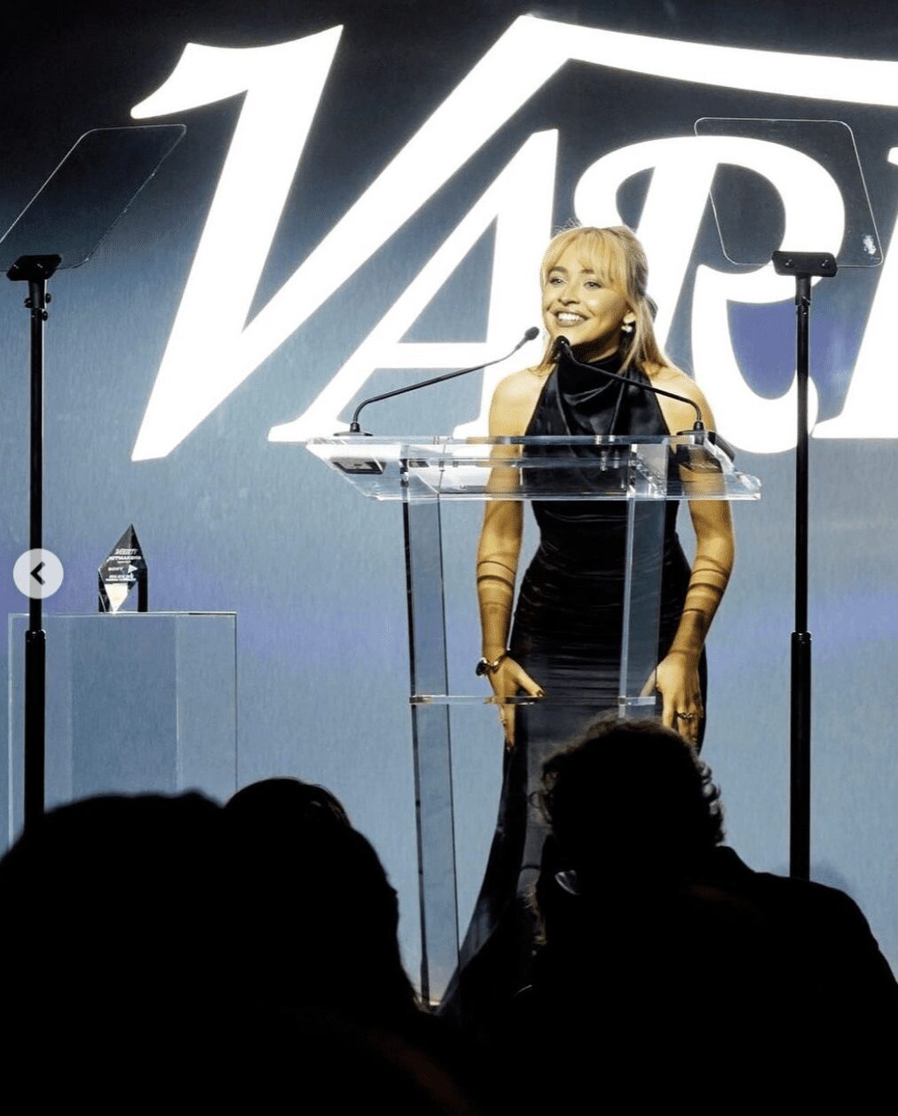 Wearing a gorgeous high neck slinky black dress, Carpenter looked incredibly elegant as she accepted her award. The silky material of the garment complemented her body in such a way that is both sexy and classy, which is the perfect vibe to emulate for Variety. Not only did she stun in this chic dress, Carpenter channeled her inner “Coquette Girlie” and topped her look off with a black bow in her hair. Effortlessly placed in a half-up half-down hairdo, styled by @_hairbylaurie on Instagram, she served preppy in the best way possible. Needless to say, I’m obsessed with this look—and Sabrina, duh!