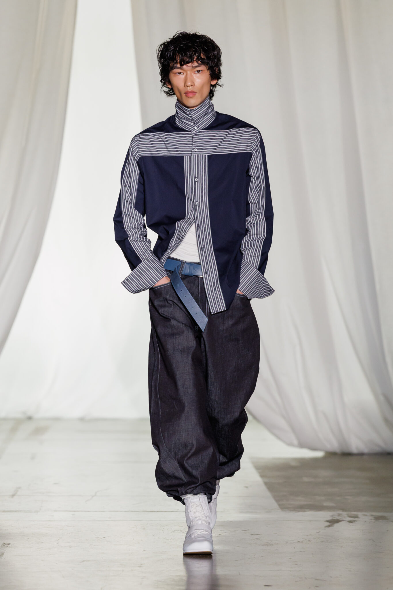 Throughout the collection, tailoring is deconstructed and reassembled. References to 1980s British and Italian power suits appear in jackets with built-in hoods, detachable sleeves, and shirts marked by precise horizontal and vertical lines. Crafted from stretch cotton, these pieces translate Nash’s movement-driven philosophy into a more elevated, sculptural form. Formalwear continues to evolve with pinstriped all-in-one jumpsuits made from merino stretch wool. Cut wide and intentionally warped, the silhouettes respond dynamically to motion, echoing the theatrical nature of masquerade costumes while expanding the brand’s exploration of tailoring.