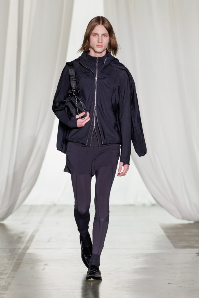 Also previewed during the show was SLNSH Spring 2026, Nash’s ongoing collaboration with Lululemon. Select men’s and women’s looks hinted at a softer, nature-inspired direction, with transformable jackets, barrel trousers, and technical accessories that continue to blur the line between performance and lifestyle.