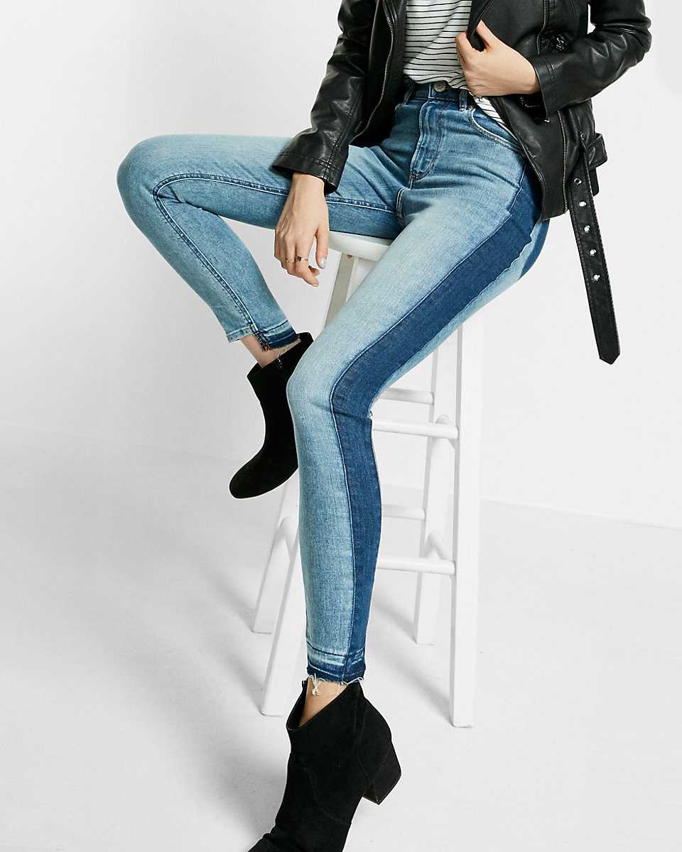 - EXPRESS High Waisted Contrast Panel Ankle Jean Legging,$52.80