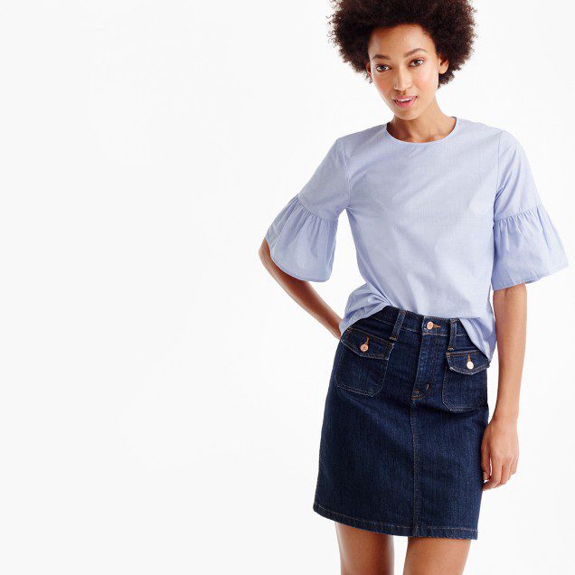 - J.Crew Button back bell-sleeve top, $59.50, Patch pocket denim skirt in Foxley wash $88.00