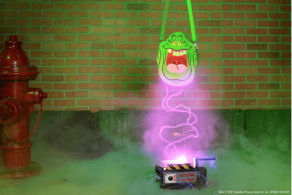 Featuring everyone’s favorite ghost Slimer! This hybrid bag can be worn multiple ways. The back has the GHOSTBUSTERS™ name logo stamped on it. The inside is lined in a fun slime green novelty print. Includes green faux leather straps.