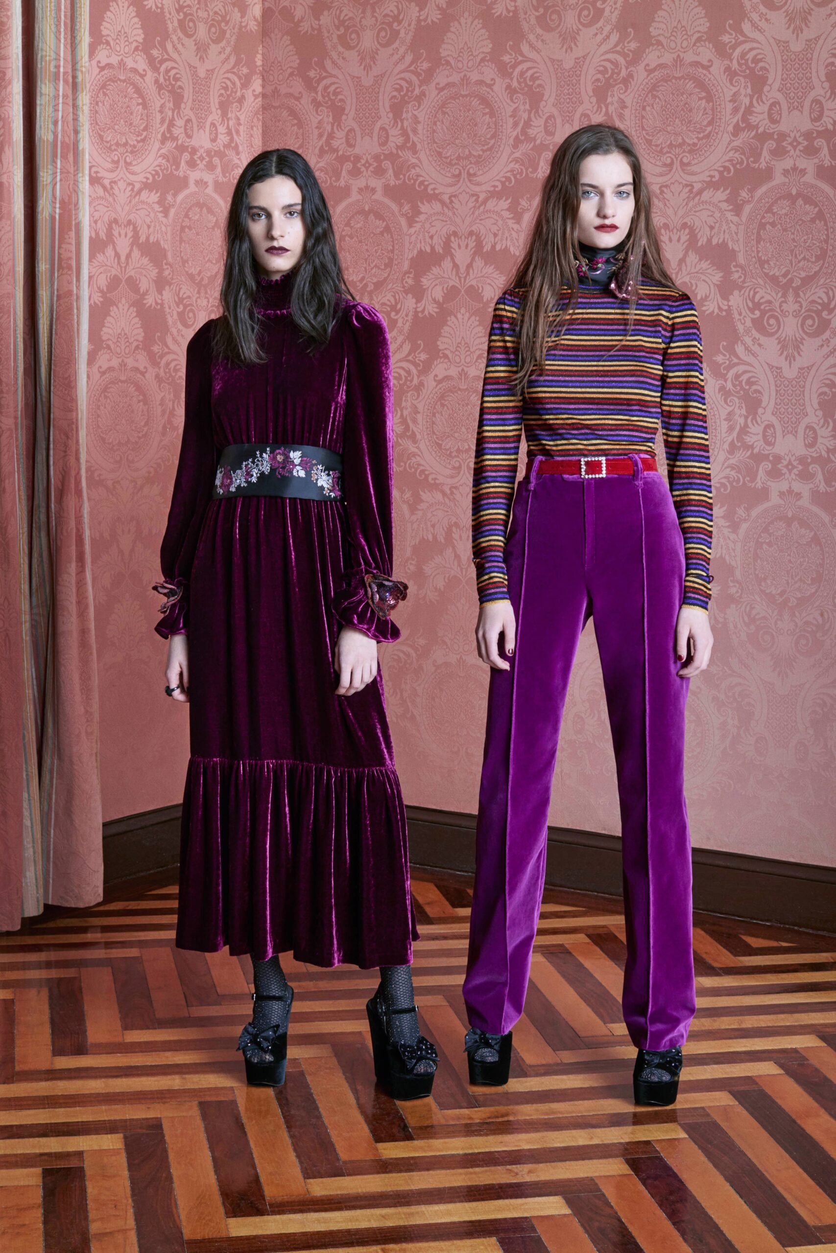 Sarah Staudinger’s fall runway show was all about women living their best lives. The presentation proved to be an exuberant, if not festive event that celebrated fashion, accessories and everything pretty. For their Fall RTW 2019 collection the namesake label appeared on the runway as a montage of prints – stripes, plaids, floral, animal, and not to mention two pieces with printed mushrooms. The models danced carelessly, joyfully down the runway, some in pairs and others solo, just loving life and fashion altogether. These playful, yet highly exquisite clothes were signature of the designer’s aesthetic pushing for diversity while pulling from convention. The inventive looks were reminiscent of seventies, eighties and nineties styles with a touch of retro disco, opposing more chic pear trimmed dresses, and set against matching sets, and fringe ensembles. It was all so beautiful, so glamorous, yet can still be considered casual – perfect for our everyday princesses masquerading as a fallen angel.