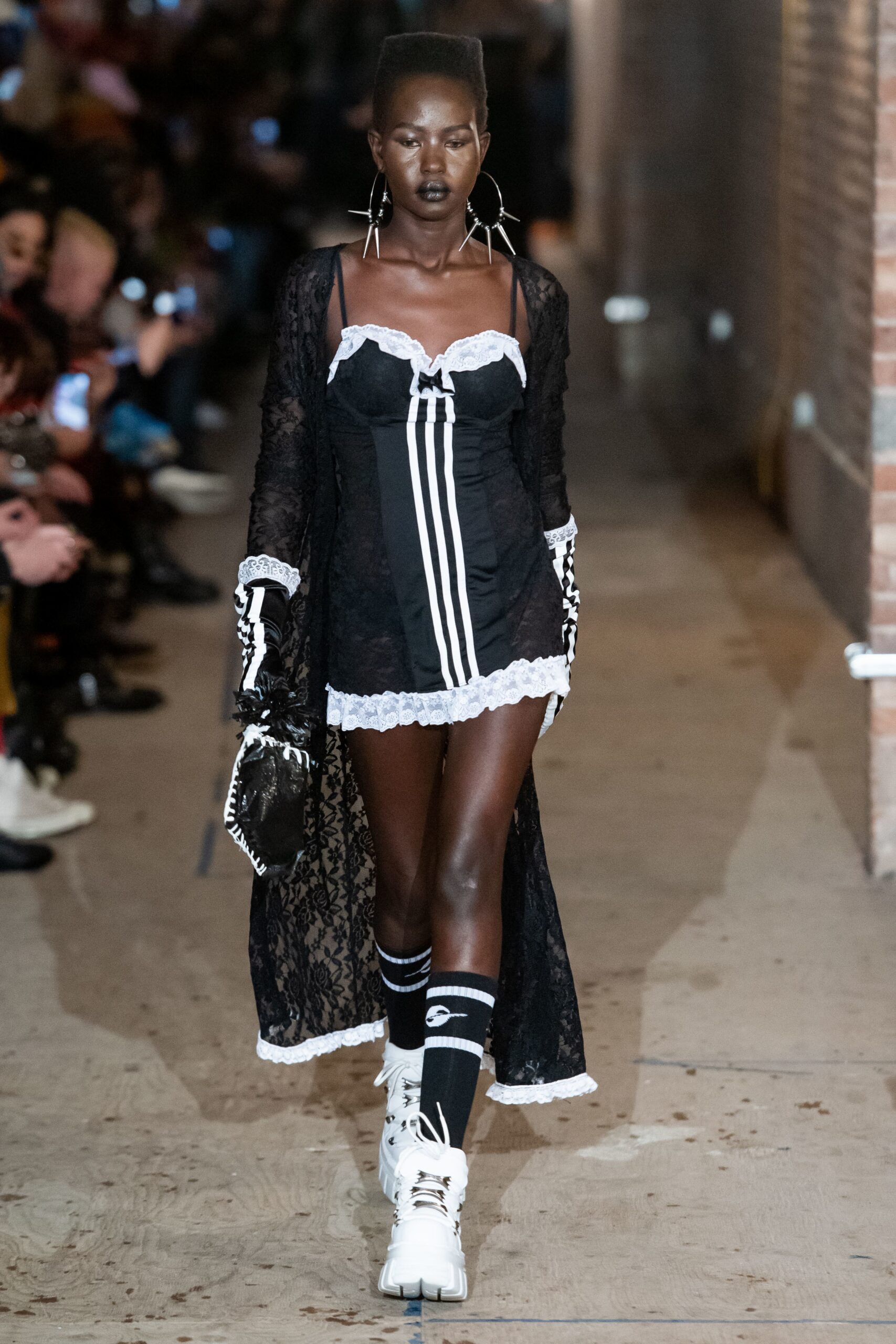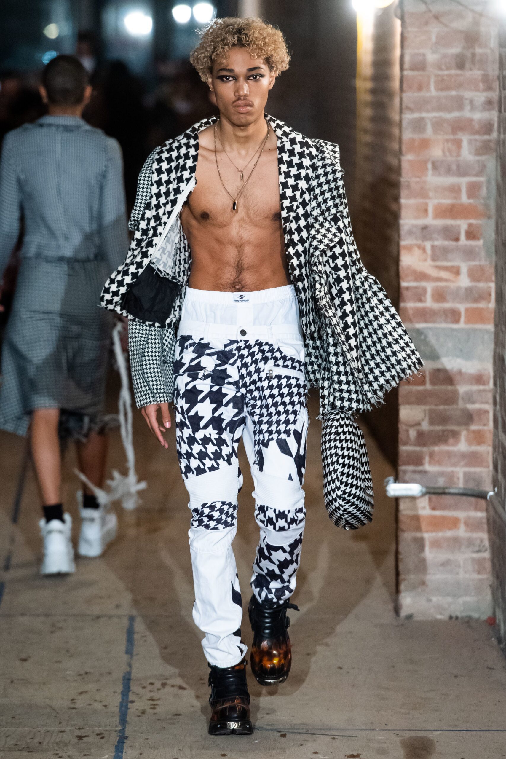 For this season’s Gypsy Sport presentation, Rio Uribe delivered a spine-tingling on the basis of fluidity, retrogression, and direct insurgence, a characteristic that has come to define the newfangled brand. The evocative, barely-covering pieces of the collection featured a wearable mix of lingerie and sportswear, modeled by both mean and women. In a mood of striking attitude and confrontational seduction was a display of lace underwear, contrasted by mini slip dresses, satirical graphic motifs printed on battle caps embellishing an exta-extra suit, and utterly show stopping frisky knitted denim piece overlaying leather black underwear. Rendering sustainability one of his tope priorities, Uribe has exceeded expectations. Making underwear a new outwear garment, sharpening his skills of trend driving innovation in a way that upturns establishment.