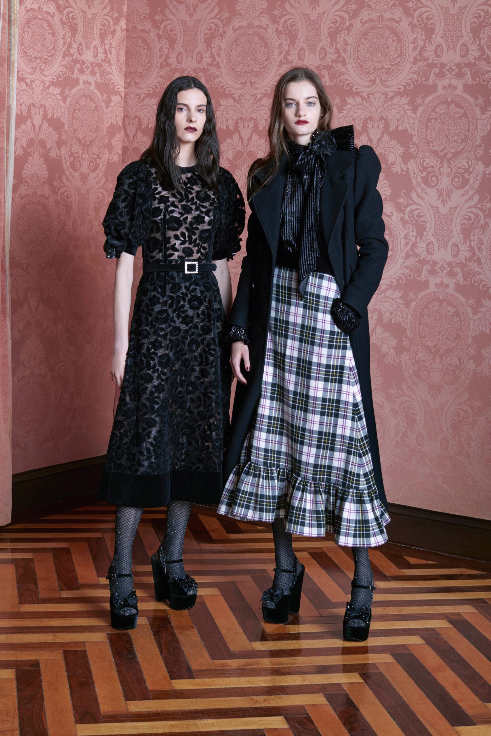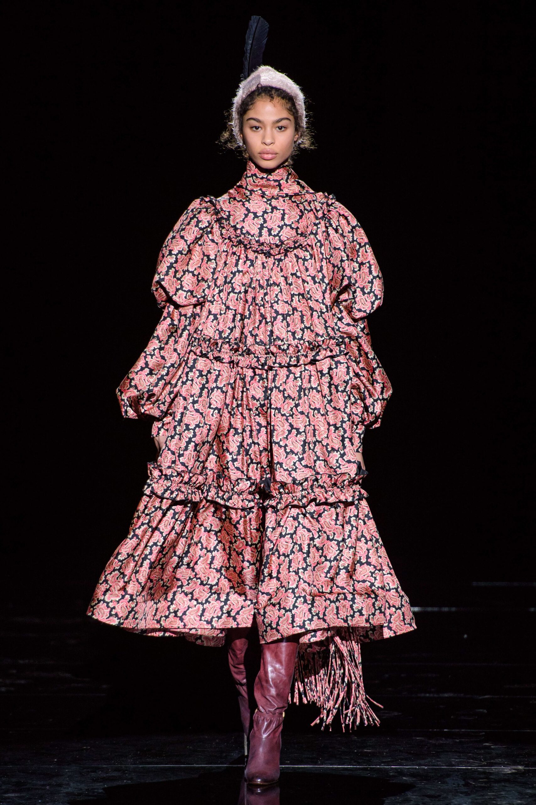 The models in Marc Jacob’s RTW Fall 2019 collection represented a daunting exchanged between whimsical joy and obscure intimacy. The models commanded the crowded space, walking on a well-lit reflective black floor installed by Jacobs in the Park Avenue Armory. Each look reminiscent of dazzling fifties couture. With less than 180 seats and forty looks to present, the show was seclusive and dark, conjuring up a feeling of déjà vu to a time of spotlighted, small runway shows. Each look in the show was highly focused and harped an angelic, if not dreamlike kind of beauty between full volume gowns and masterpieces of feathers, sequins, plaids, and knits.