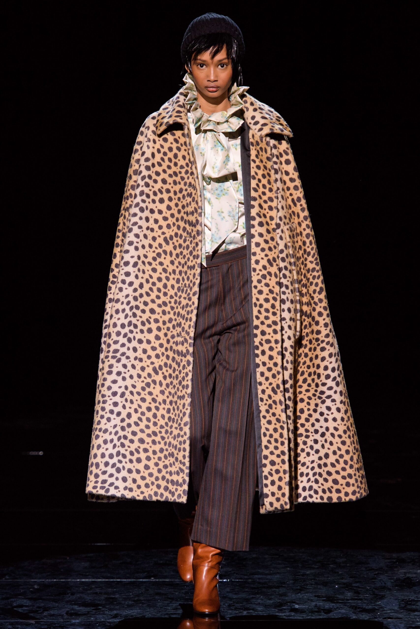 Sarah Staudinger’s fall runway show was all about women living their best lives. The presentation proved to be an exuberant, if not festive event that celebrated fashion, accessories and everything pretty. For their Fall RTW 2019 collection the namesake label appeared on the runway as a montage of prints – stripes, plaids, floral, animal, and not to mention two pieces with printed mushrooms. The models danced carelessly, joyfully down the runway, some in pairs and others solo, just loving life and fashion altogether. These playful, yet highly exquisite clothes were signature of the designer’s aesthetic pushing for diversity while pulling from convention. The inventive looks were reminiscent of seventies, eighties and nineties styles with a touch of retro disco, opposing more chic pear trimmed dresses, and set against matching sets, and fringe ensembles. It was all so beautiful, so glamorous, yet can still be considered casual – perfect for our everyday princesses masquerading as a fallen angel.