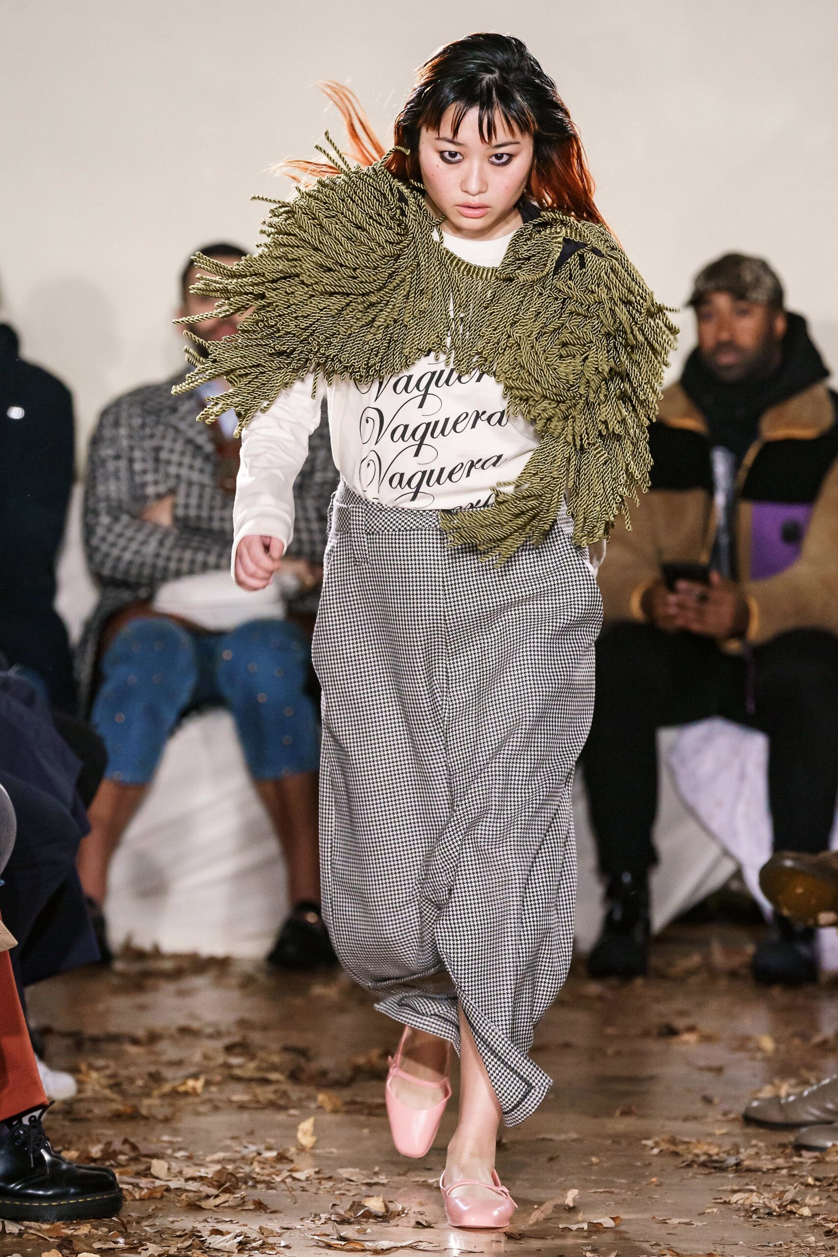 Vaquera upturned home decor for a collective that spoke to income inequality. The brand’s designers, Patric DiCaprio, Bryn Taubensee and Claire Sullivan parodied one of the most debated political issues of our nation’s day by exploring surface trappings and obsessing over antique showpieces. Decorative home items were explored, speaking to many of our secret habits of using home decor as a means to conceal our financial insecurities. The quirky collection was held in a Ukrainian banquet hall on the Lower East Side, making for an unusual locale, unconventional for the industry standard, but still managed an intimate runway experience, not lacking of show-stopping and exaggerated pieces. The eccentric, schizo collection included an 18th century, Marie Antoinette over-the-top gown of white toweling, a life-sized present complete with a promising gown, and a duvet, and a dress constructed of a lampshade – the concept of a well-kept home indeed.