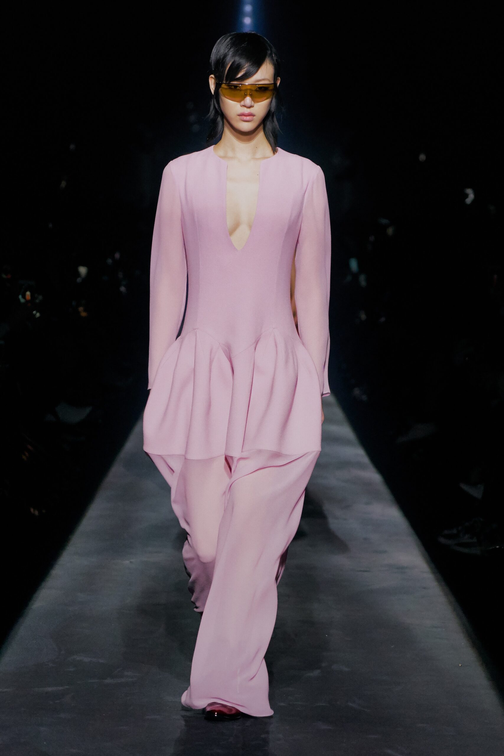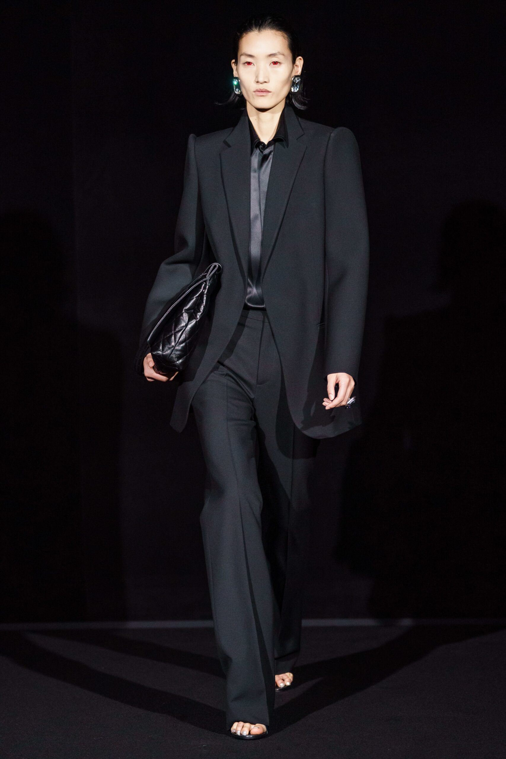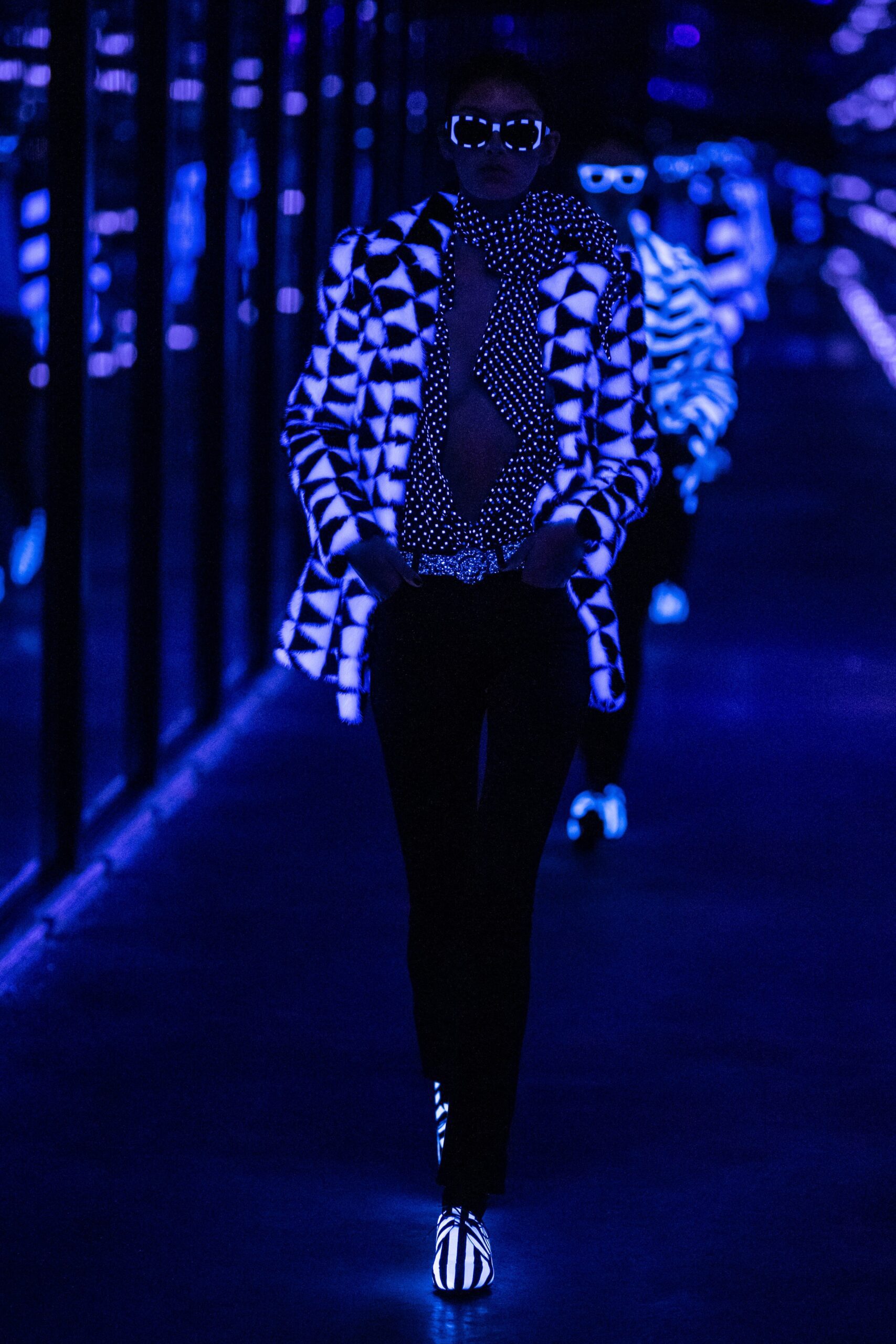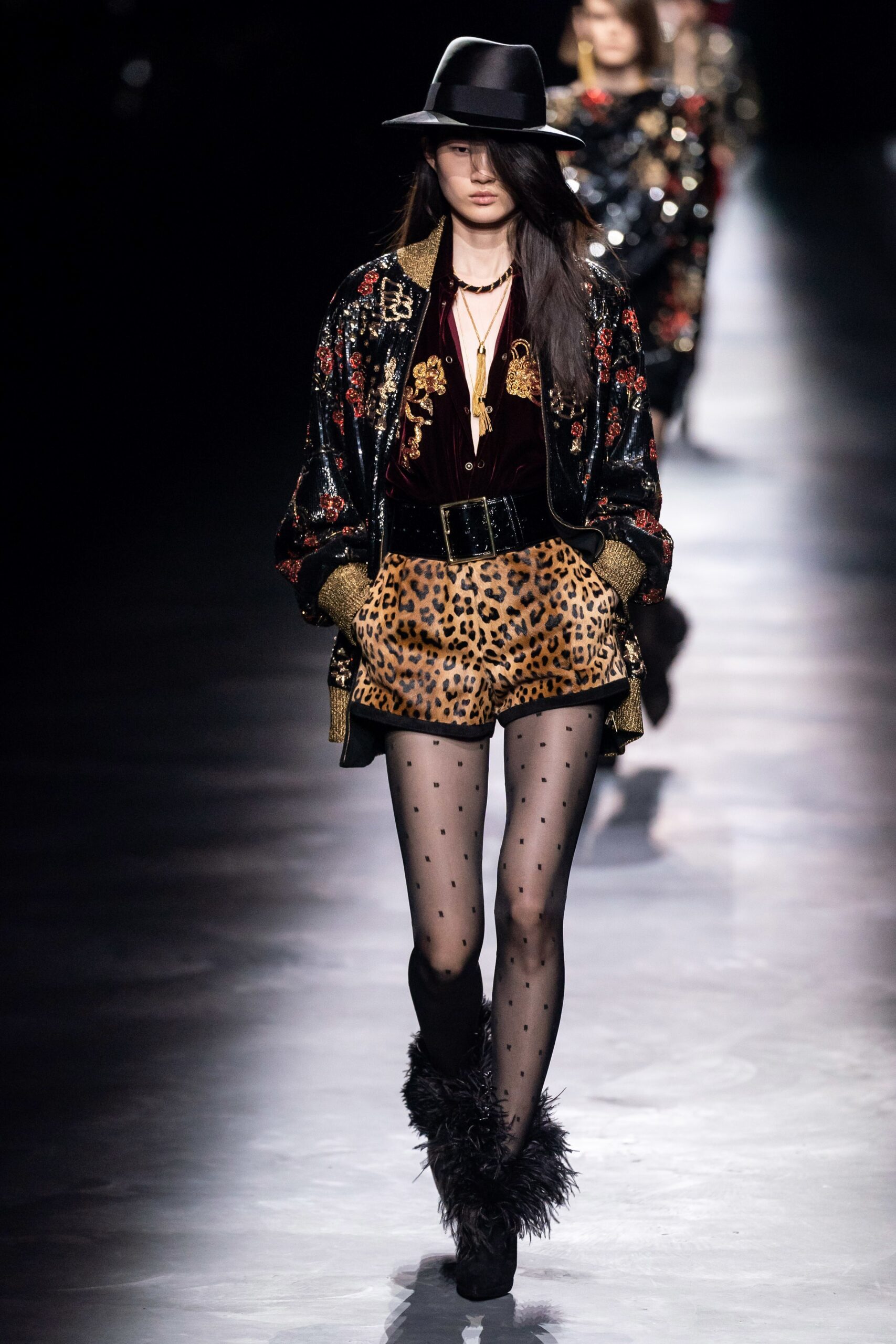 Anthony Vaccarello’s Ready-To-Wear Fall 2019 collection for Saint Laurent during Paris Fashion Week made an underground rave, illuminated by flashing lights and infinity mirrors, with models gliding down the runway in a gleaming patch of fluorescence. The designer focused on a straight silhouette – a ‘power’ motif that offered masculinity to tuxedo jumpsuits, straight-lined blazers, and padded shoulders. Vaccarello, famous for his minidress ensembles, did not disappoint, with a red, oversized piece capturing our attention – velvet bow in blood red, while another satin mini dress was a classic black paired with polka dot stockings.
