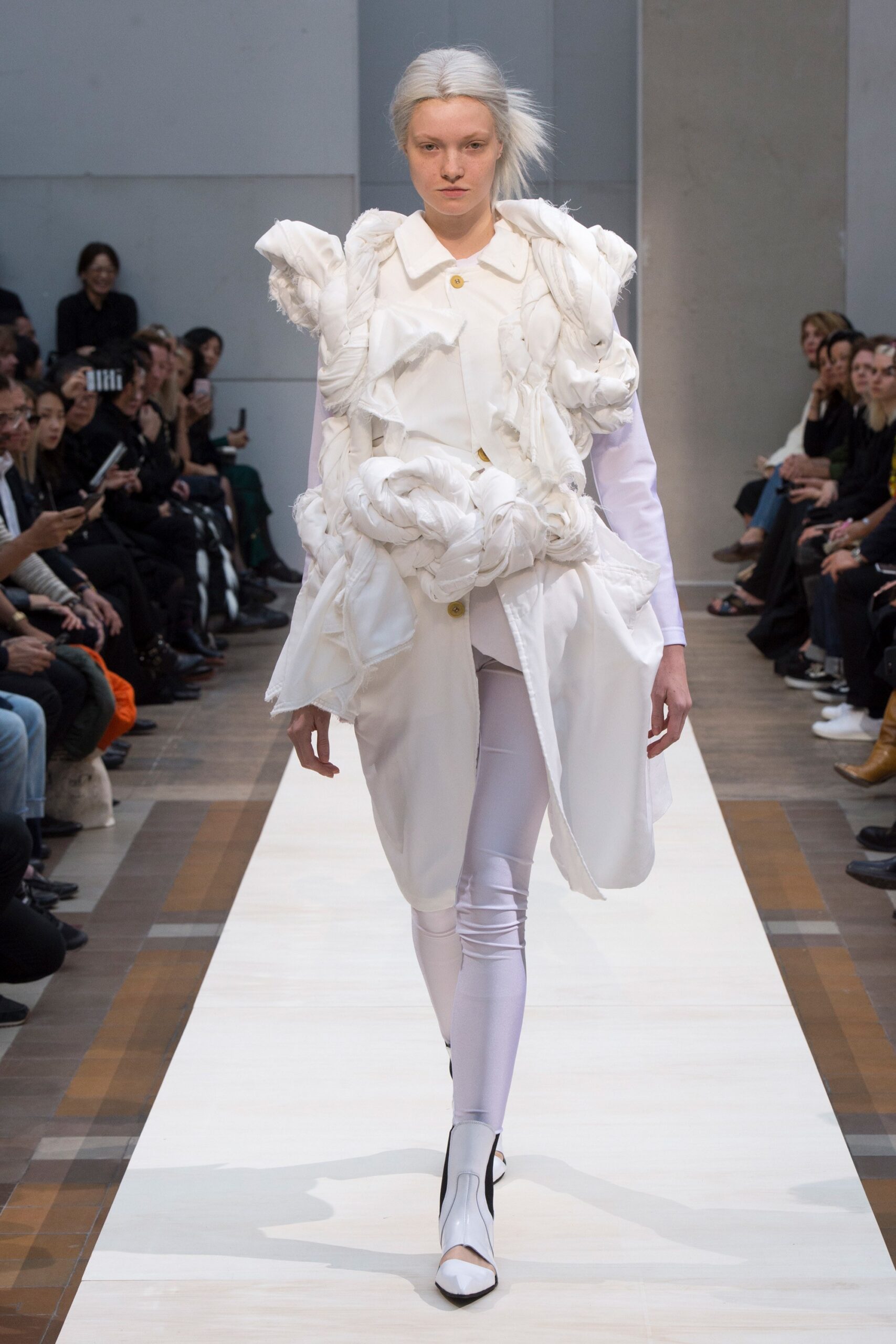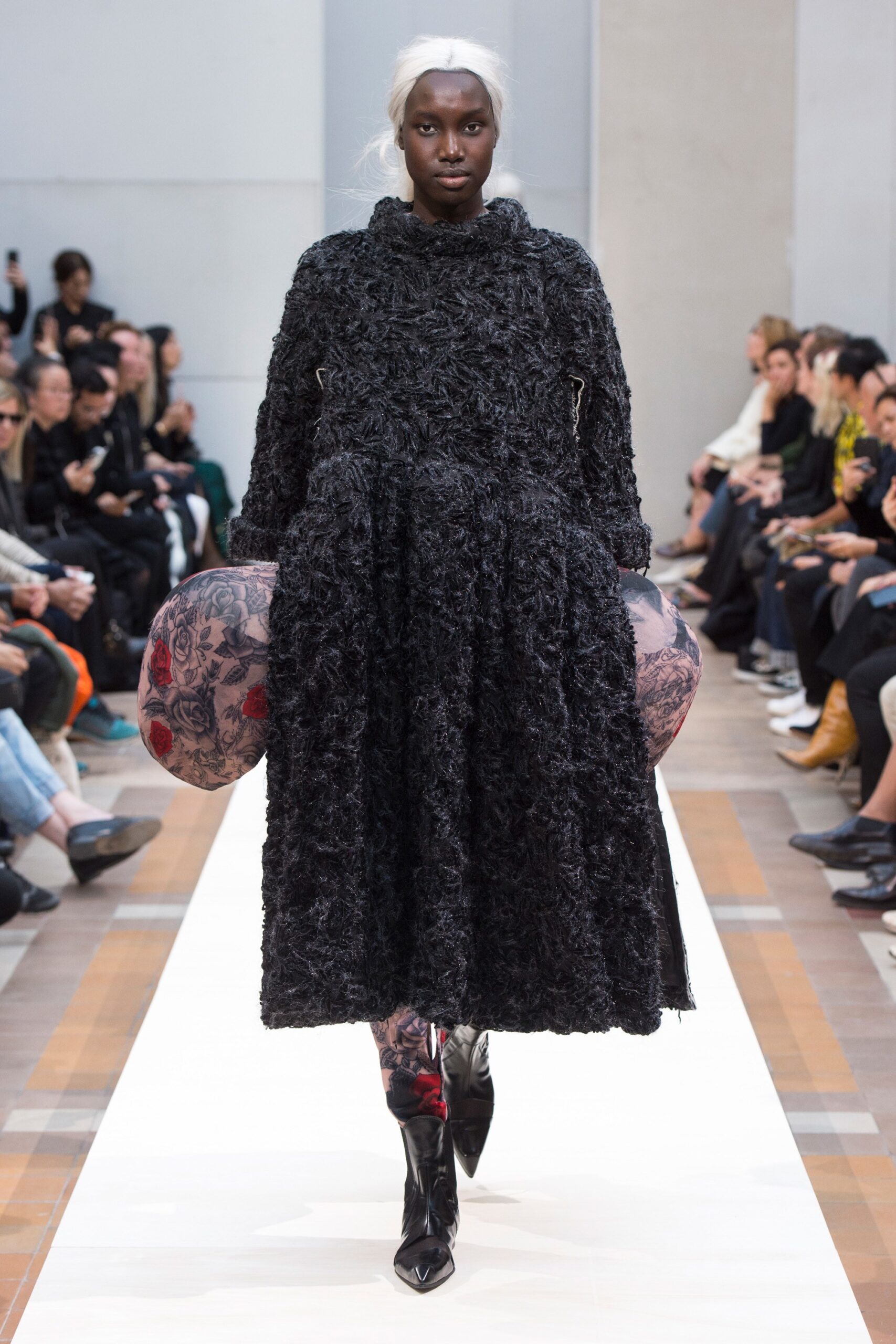 This season, Rei Kawakubo “fumbled around in the dark” to create a truly abstract, if not, an overshadowed and cryptic Fall 2019 collection. Her designs are meant to reflect the state of the world: riotous, warlike, disquieting – inconsistent. Yet, masquerading to “All Things Bright and Beautiful.” The designer’s innovative vision resulted in high glamour with a Marie Antoinette vibe. This meant for warrior-like hoods, mixes of materials, gothic puffs and ruffles, and Victorian0inspired dresses with floral patterns. The finale was especially disconcerting with models strangely tilting their heads up to the light above, uniting in a tight circle.