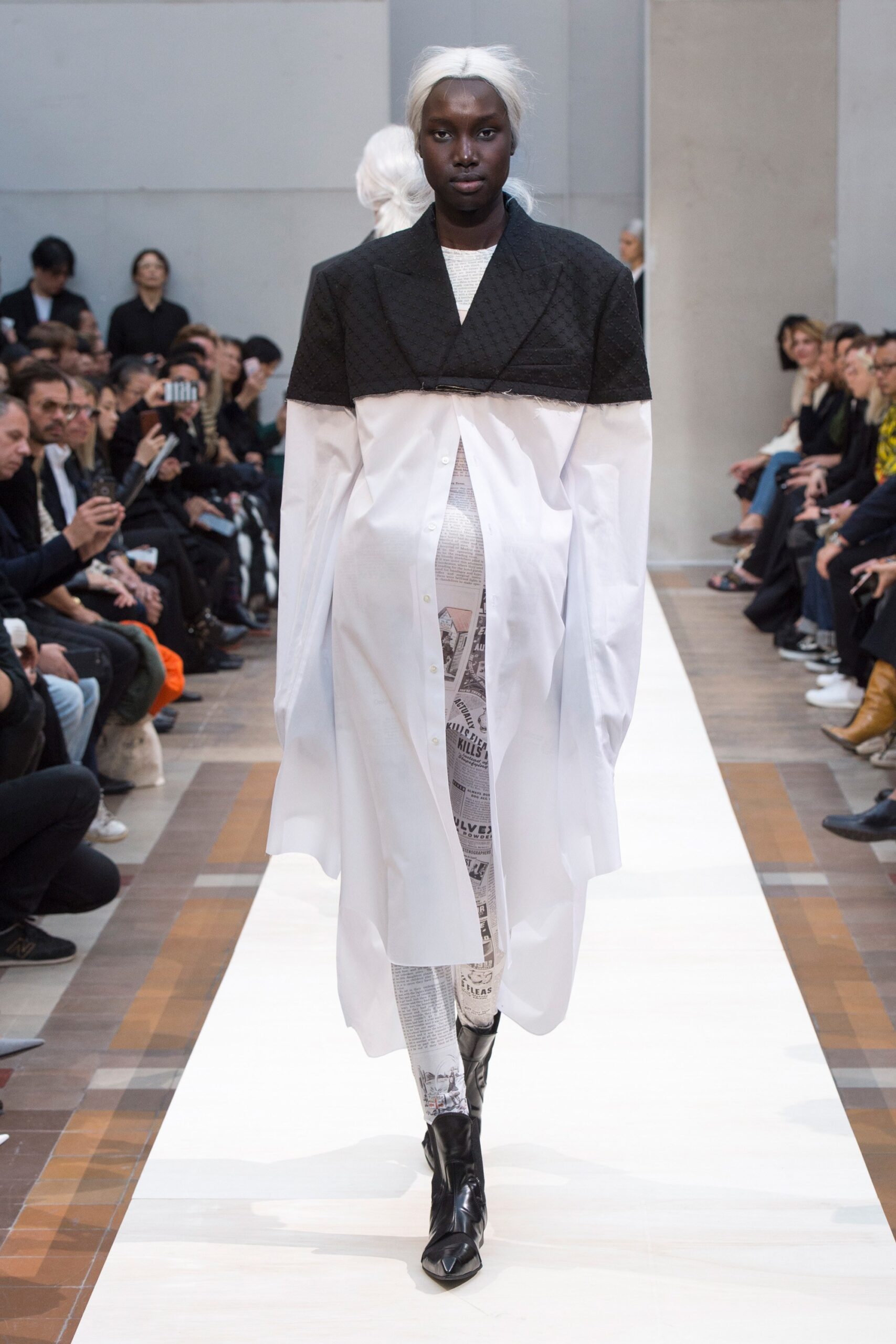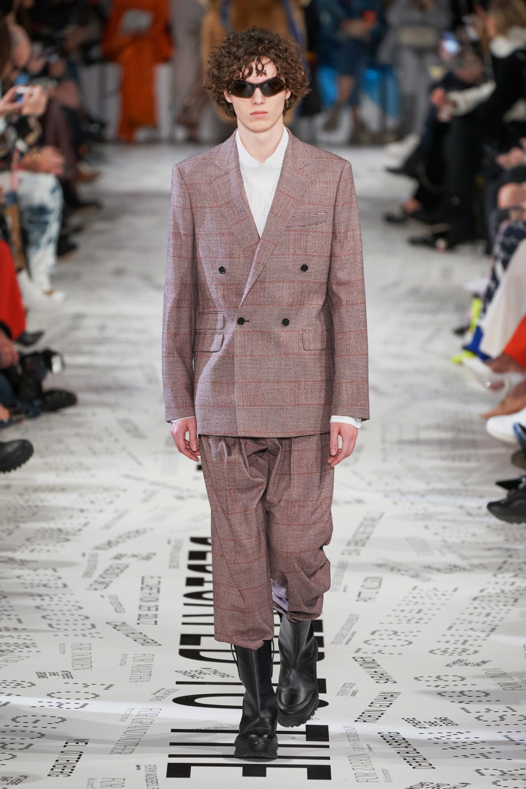 The mythic Parisian was Demna Gvasalia’s muse this season, creating a narrative of “the real Parisian of today.” In a dark setting of tar-smelling asphalt and dim light, models briskly sauntered past observers in vibrant, daring clothing of Cristóbal Balenciaga’s signature shapes: cocoons, baby dolls, waist-hugging fits. The Parisian theme took a dark turn with garments representing the culture through French history: from the elegance of the fifties and sixties to patters and prints that alluded to daily activities such as grocery shopping, commuting via métro as well as after-work shenanigans.