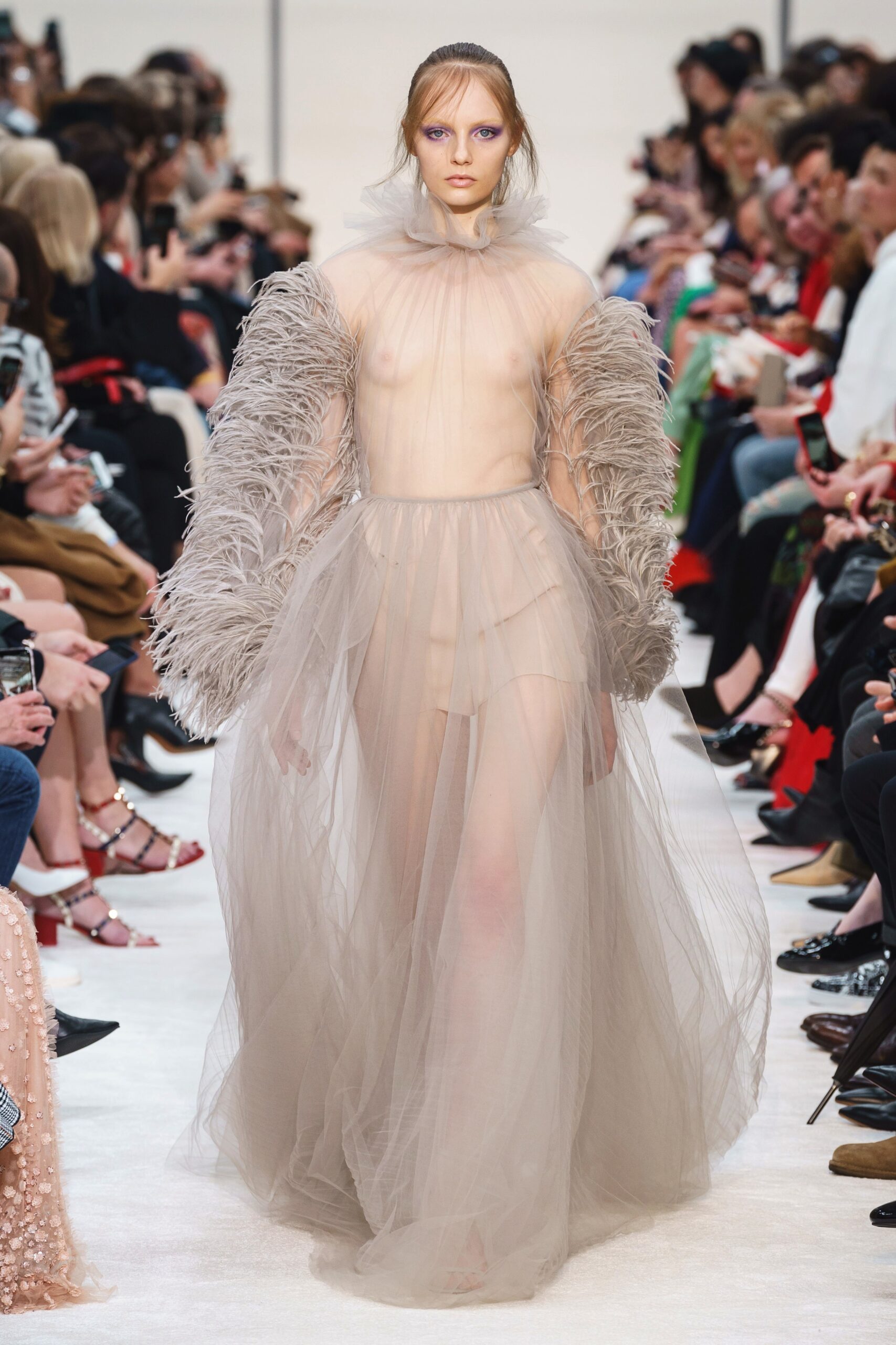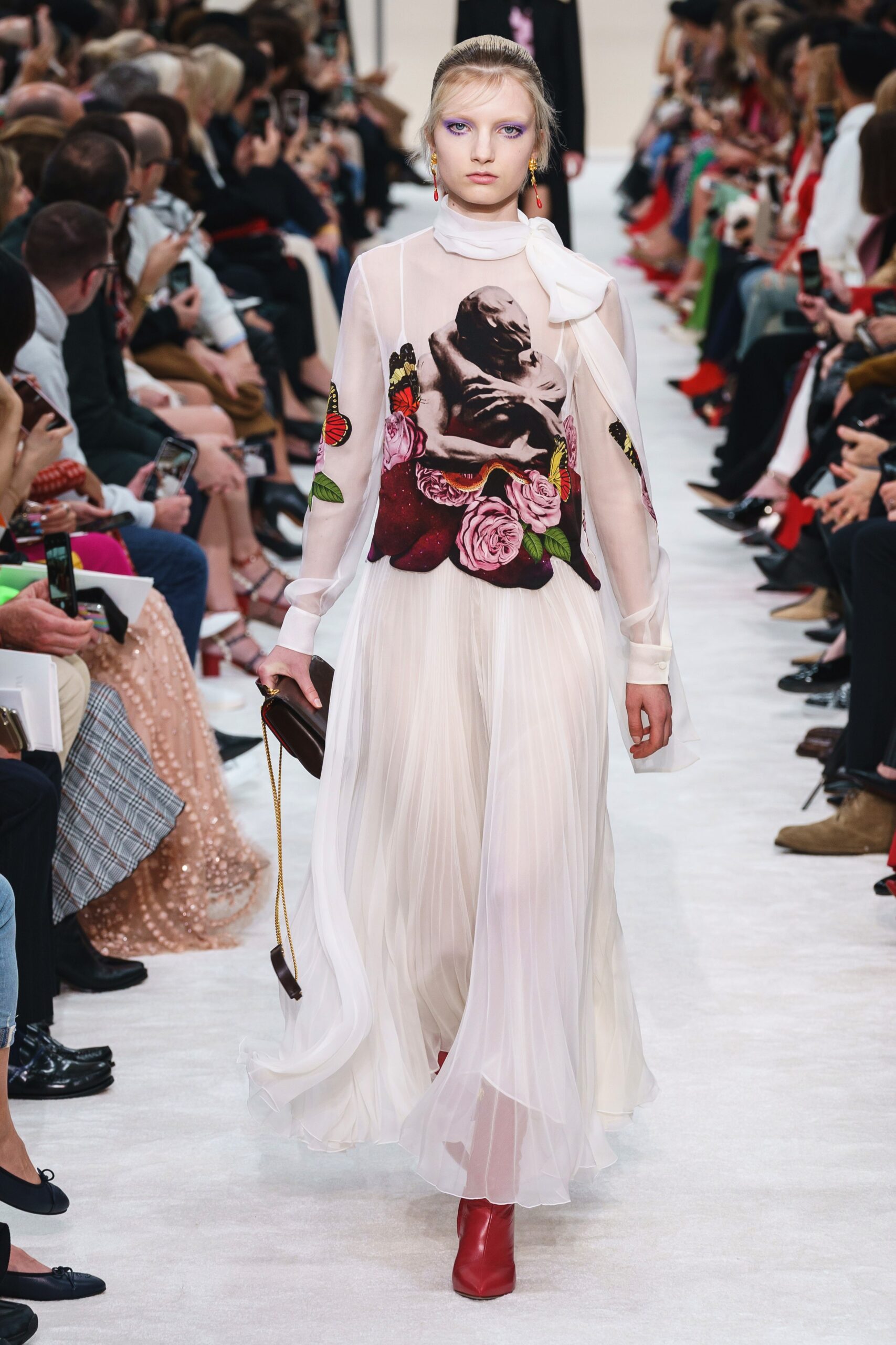 “I think of poetry as something that is still beautiful, but it can be contemporary as well,” Valentino’s creative director, Roman designer Pierpaolo Piccioli said during a preview for his Fall 2019 RTW collection. The Movement for the Emancipation for Poetry, a romantic movement belonging to the past created a romantic mood for the designer. His focus this season was to introduce couture to ready to wear, thus modernizing the style and making it more appealing to a younger generation. The designs were glorious with a shortened haute couture coat of orange feathers, a turtleneck mini dress with delicately sewn in roses. The romantic shapes created the classiness we relate to red carpet glamour, while the black suits and long skirts made for a breathtaking spout of freshness that made for a stunning show.