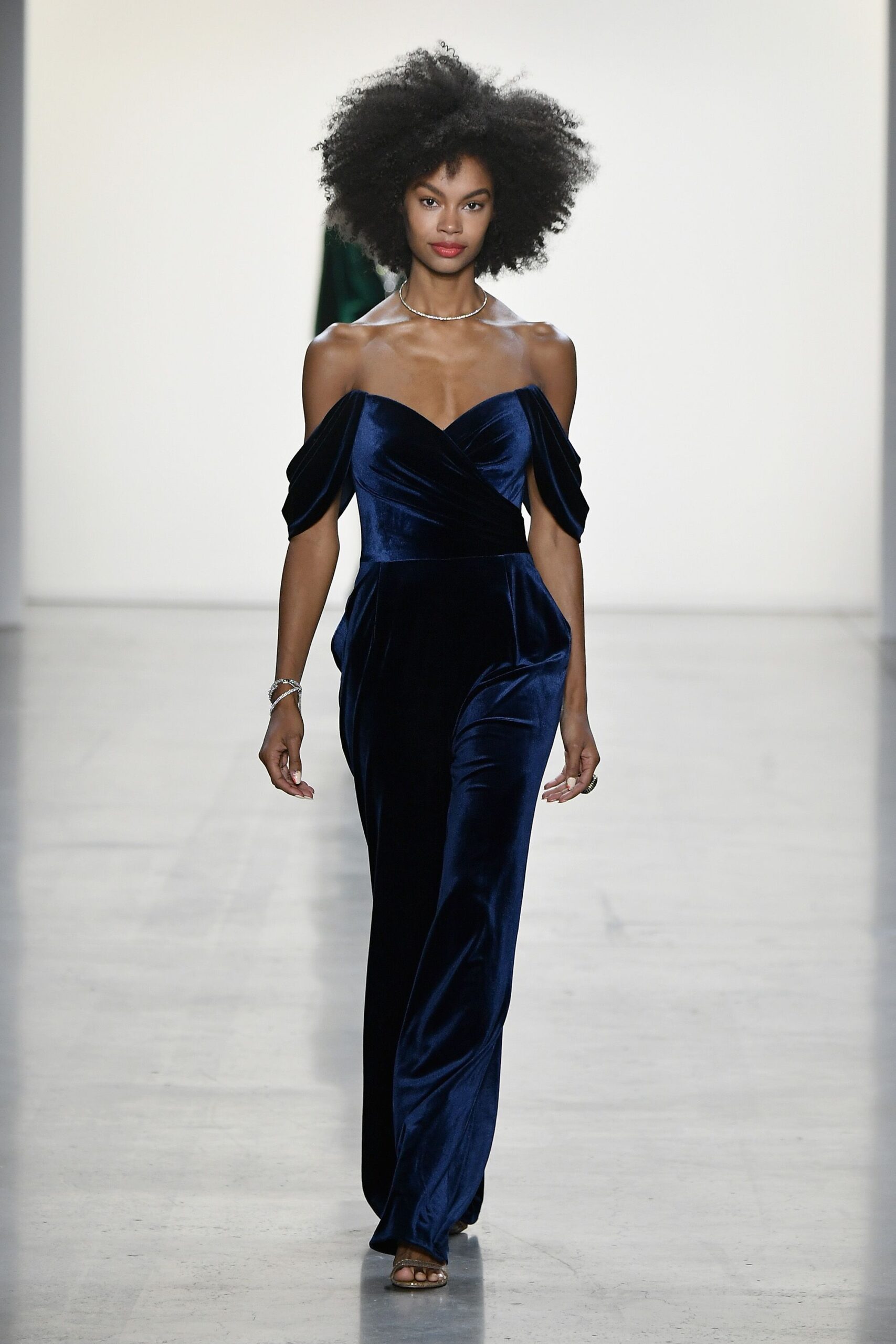 Reiterating his elegant palette of deep blacks, midnight blues and romantic reds, Shoji played on modern, on trend silhouettes in this season’s line. The artist’s cast of beautifully diverse women stepped onto the runway in mesmerizing ombre skirts, off the shoulder ruffled sleeves, and scooping necklines, elevated in luxurious fabrics. The thriving, internationally acclaimed designer’s show also included stretching, long sleeve metallic dresses and magenta, glittering body-hugging gowns and flowing skirts with multi tiered silhouettes, minimally accessorized. Between posh velvet sequences of fabric, tiers of tule skirts or extravagant sequins, the collection’s aesthetic was quite the criss-cross between royal and exuberant luxury, and light and delicate grace.